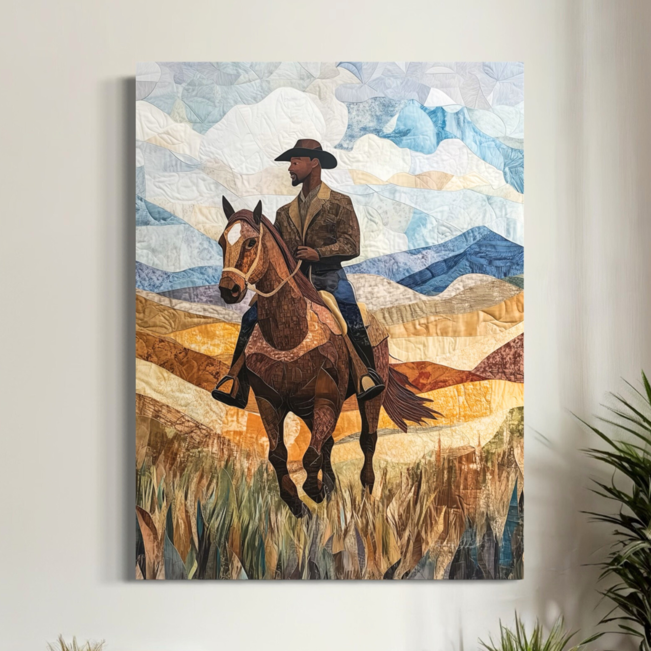 Saddle up and embrace the spirit of resilience, freedom, and tradition with Riding Free, a stunning artwork that pays homage to the legacy of Black cowboys. This captivating piece features a Black cowboy proudly and graciously riding his horse across an open valley, with a breathtaking mountain range standing tall in the distance.